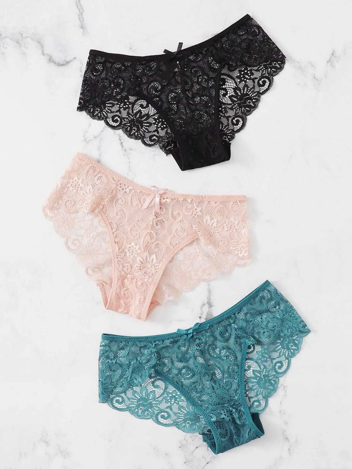 Hermoso set de panties x 3 unidades en encaje licrado, para personalizar la combinación de colores elige la opción personalizar color y al realizar tu compra nos contactaremos contigo.